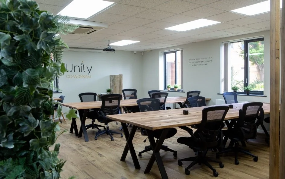 Large-format communal workspace tables (including 4m lengths) built for a calm, high-traffic co-working environment.