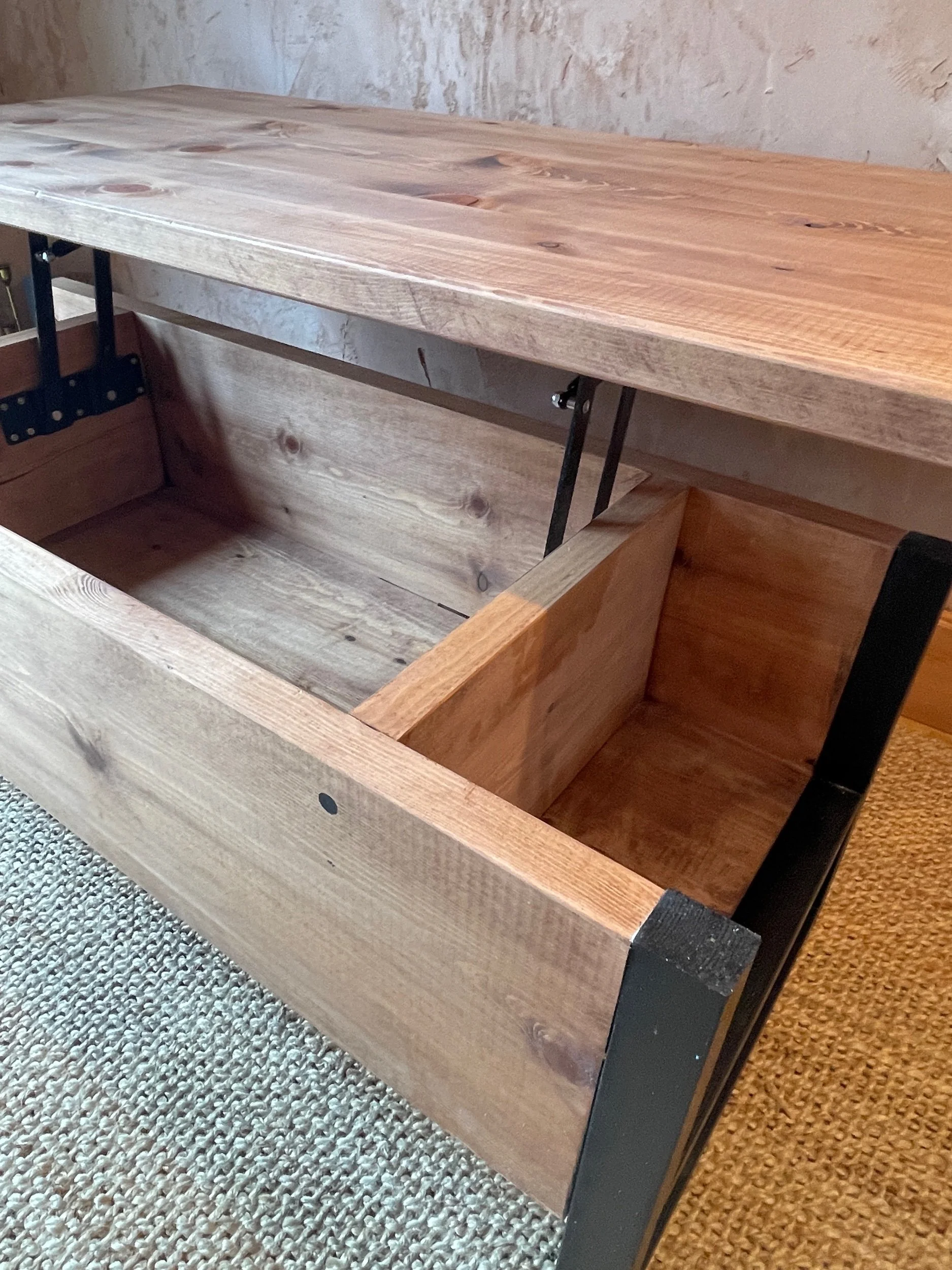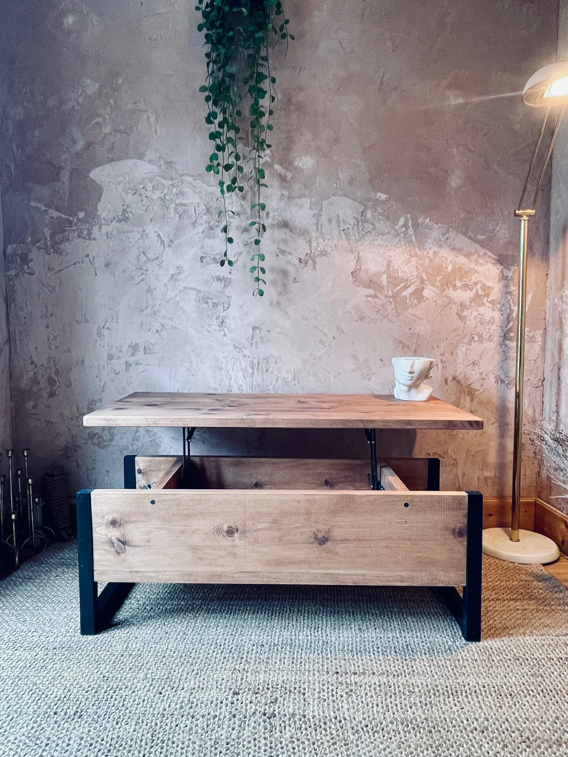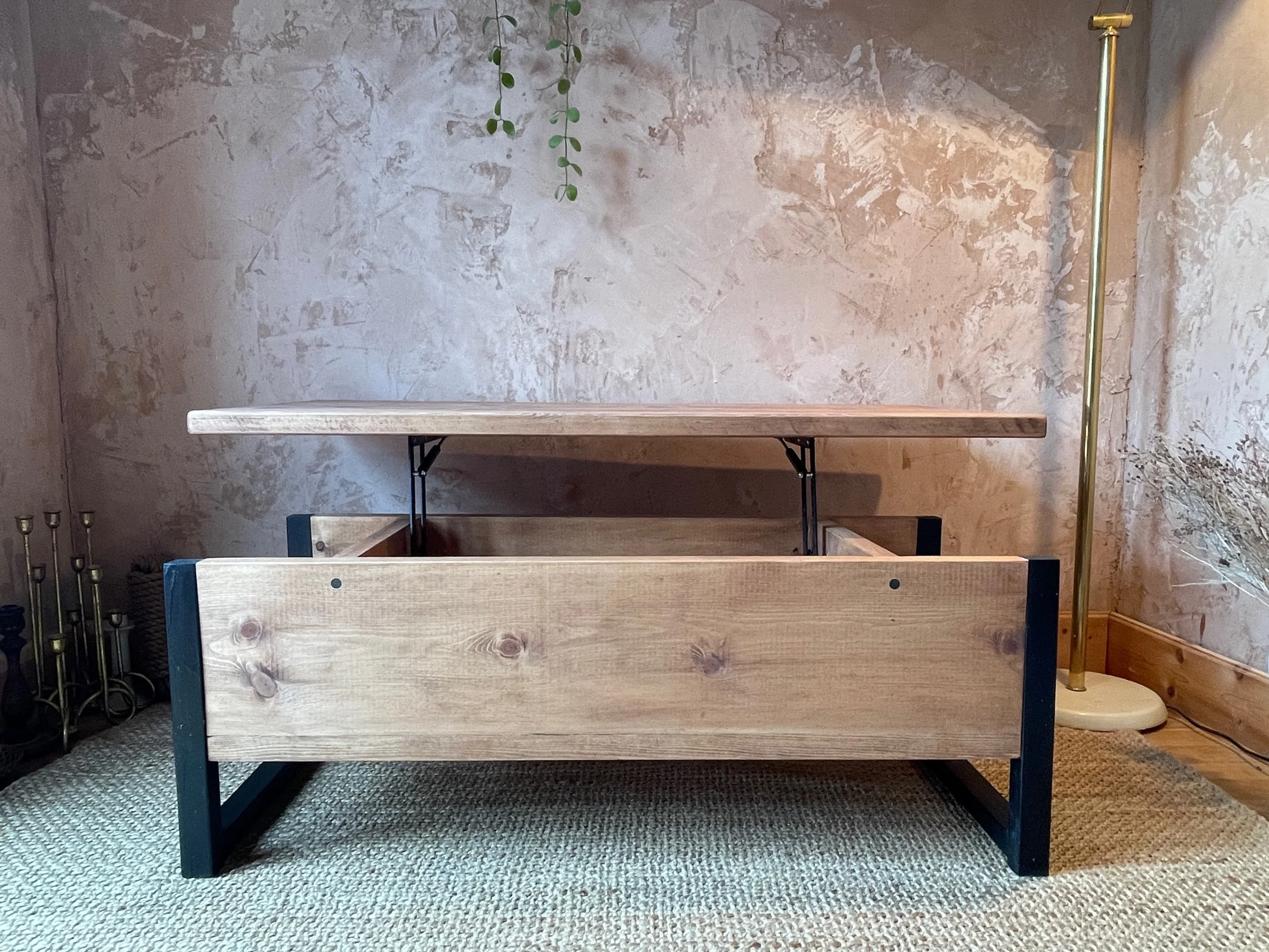 Handcrafted from solid wood, this versatile coffee table combines minimalist design with hidden functionality. The top panel lifts smoothly to reveal a generous storage compartment—perfect for tucking away books, blankets or everyday essentials—while doubling as a raised surface for working, dining or relaxing.