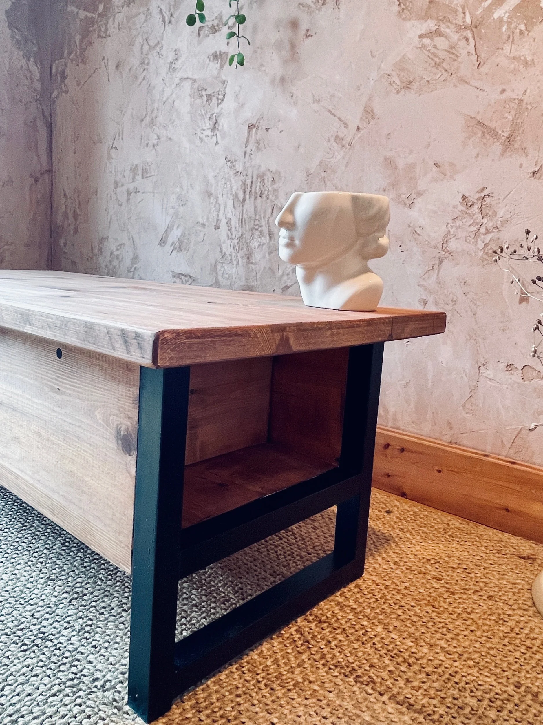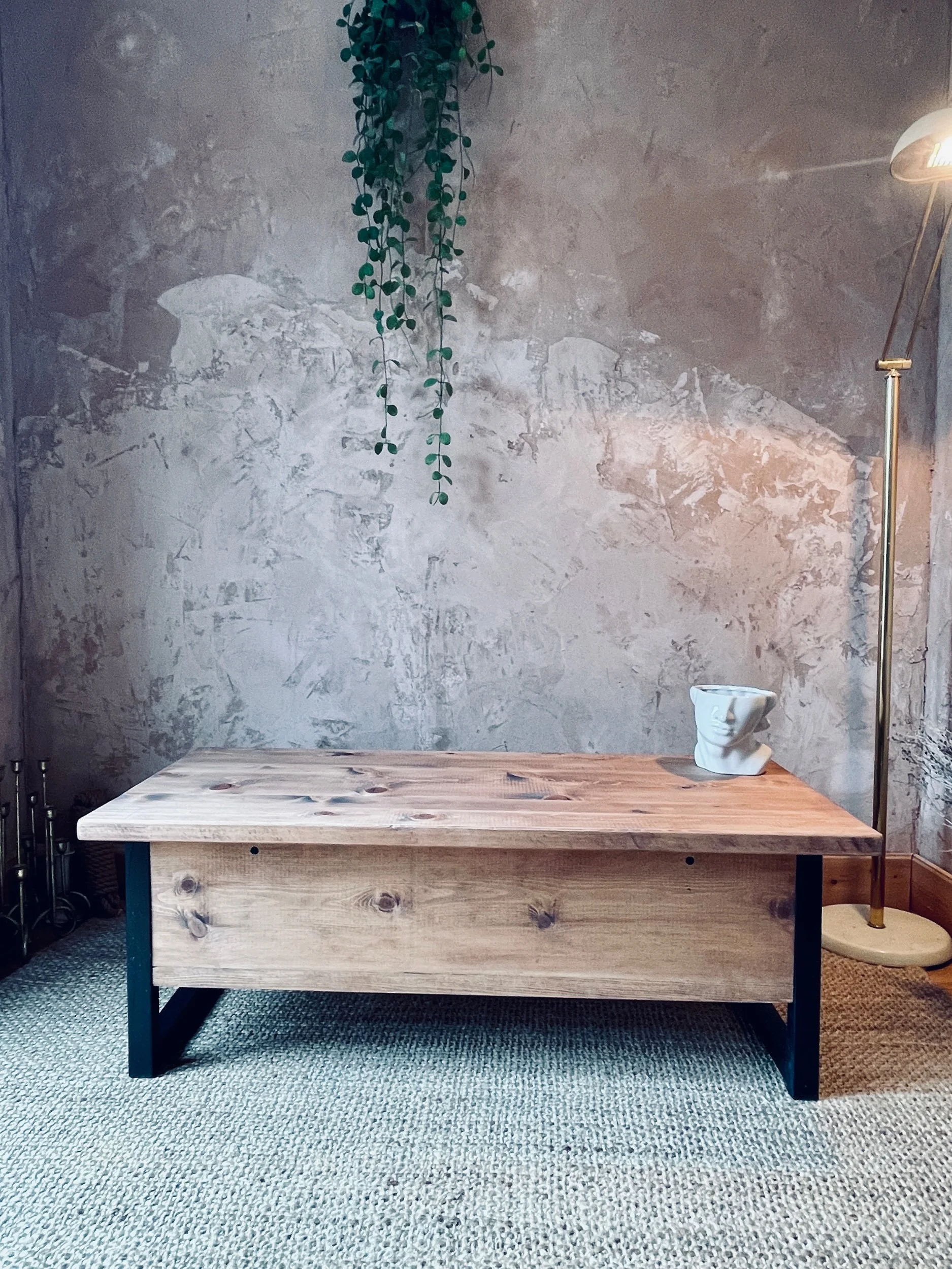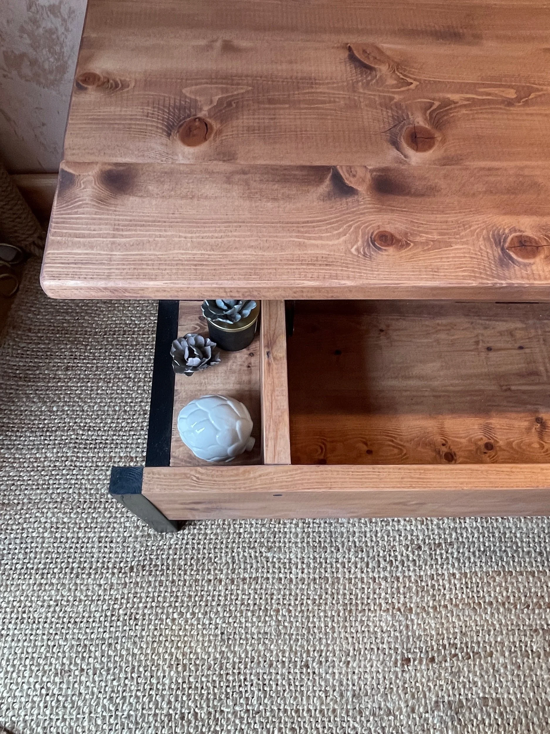 Handcrafted from solid wood, this versatile coffee table combines minimalist design with hidden functionality. The top panel lifts smoothly to reveal a generous storage compartment—perfect for tucking away books, blankets or everyday essentials—while doubling as a raised surface for working, dining or relaxing.